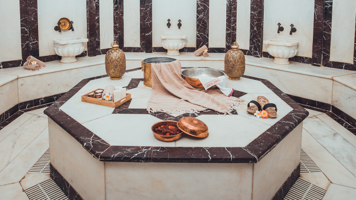 В турецком хамаме  посетители обычно ложатся на пуповину и нагревают свои тела. Это расширяет поры кожи и запускает процесс потоотделения. На этом этапе может быть проведена процедура скраба мастерами бани.